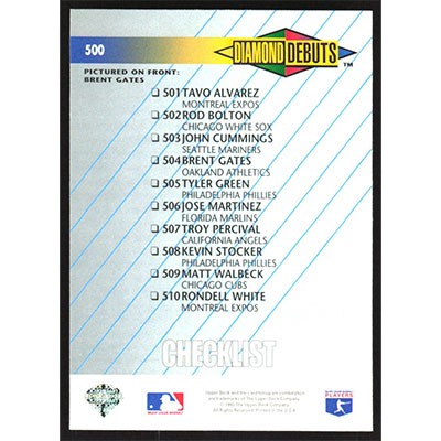 This is a 1993 Upper Deck Brent Gates Diamond Debuts Checklist baseball card. The card is #500 and pictures show condition.