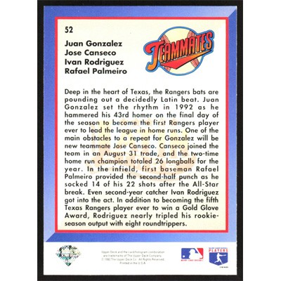 This is a 1993 Upper Deck Juan Gonzalez, Jose Canseco, Ivan Rodriguez and Rafael Palmeiro Teammates baseball card. The card is #52 and pictures show condition.