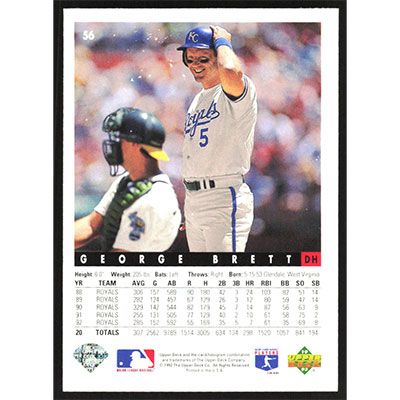 This is a 1993 Upper Deck George Brett baseball card. The card is #56 and pictures show condition.