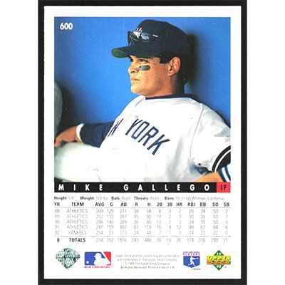 This is a 1993 Upper Deck Mike Gallego baseball card. The card is #600 and pictures show condition.