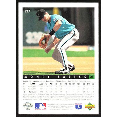 This is a 1993 Upper Deck Monty Fariss baseball card. The card is #717 and pictures show condition.