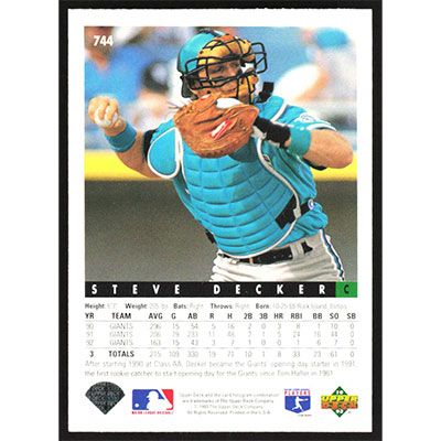 This is a 1993 Upper Deck Steve Decker baseball card. The card is #744 and pictures show condition.