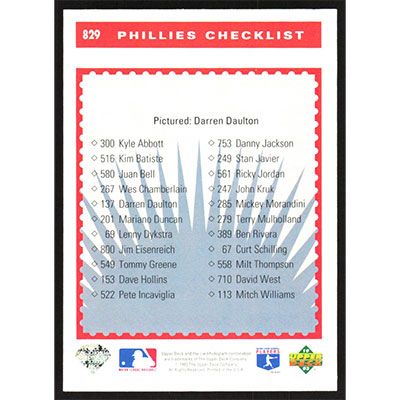 This is a 1993 Upper Deck Darren Daulton Team Checklist baseball card. The card is #829 and pictures show condition.