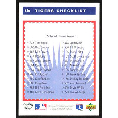 This is a 1993 Upper Deck Travis Fryman Team Checklist baseball card. The card is #836 and pictures show condition.