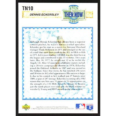 This is a 1993 Upper Deck Then & Now Dennis Eckersley baseball card. The card is #TN10 and pictures show condition. Team(s): Cleveland Indians/Oakland Athletics
