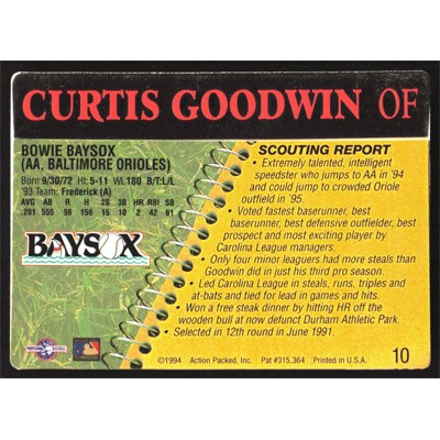 This is a 1994 Action Packed Minors Curtis Goodwin baseball card. The card is #10 and pictures show condition.