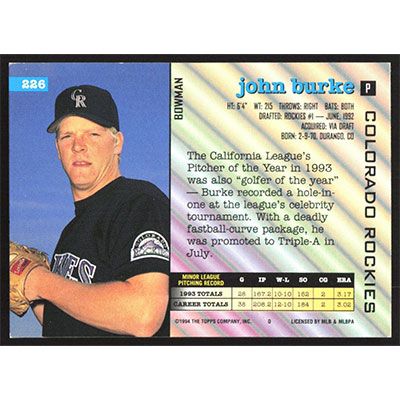 This is a 1994 Bowman John Burke baseball card. The card is #226 and pictures show condition.