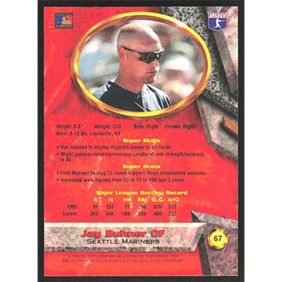 This is a 1994 Bowman's Best Jay Buhner baseball card. The card is #67 and pictures show condition.