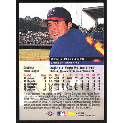 This is a 1994 Classic Kevin Gallaher baseball card. The card is #16 and pictures show condition.