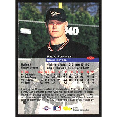 This is a 1994 Classic Rick Forney baseball card. The card is #55 and pictures show condition.