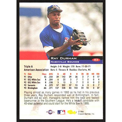 This is a 1994 Classic Ray Durham baseball card. The card is #83 and pictures show condition.