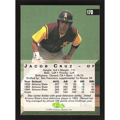 This is a 1994 Classic Four Sport Jacob Cruz baseball card. The card is #170 and pictures show condition.
