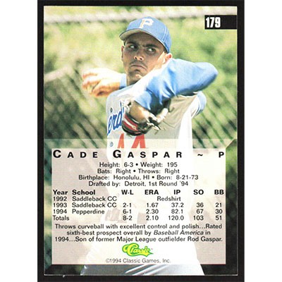 This is a 1994 Classic Four Sport Cade Gaspar baseball card. The card is #179 and pictures show condition.