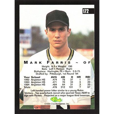 This is a 1994 Classic Four Sport Gold Mark Farris baseball card. The card is #172 and pictures show condition.