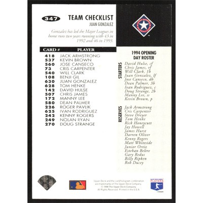 This is a 1994 Collector's Choice Juan Gonzalez Team Checklist baseball card. The card is #347 and pictures show condition.