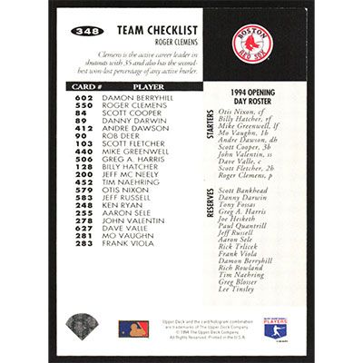This is a 1994 Collector's Choice Roger Clemens Team Checklist baseball card. The card is #348 and pictures show condition.