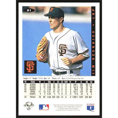 This is a 1994 Collector's Choice Jim Deshaies baseball card. The card is #91 and pictures show condition.