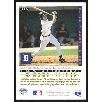 This is a 1994 Collector's Choice Silver Signature Chris Gomez baseball card. The card is #110 and pictures show condition.