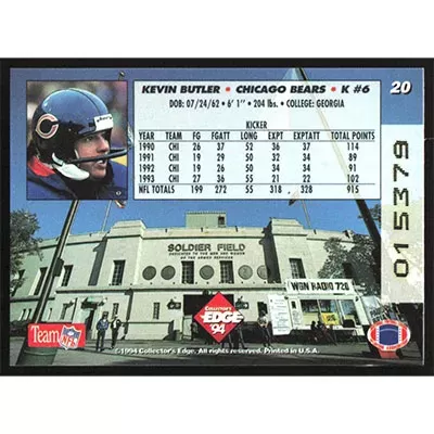 This is a 1994 Collector's Edge Gold Kevin Butler football card. The card is #20 and pictures show condition.