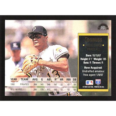 This is a 1994 Donruss Carlos Garcia baseball card. The card is #161 and pictures show condition.
