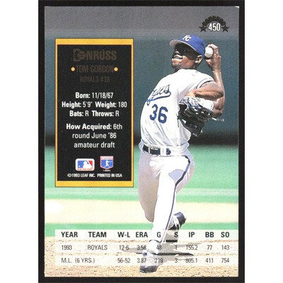 This is a 1994 Donruss Tom Gordon baseball card. The card is #450 and pictures show condition.