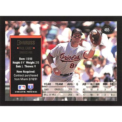 This is a 1994 Donruss Paul Carey baseball card. The card is #465 and pictures show condition.