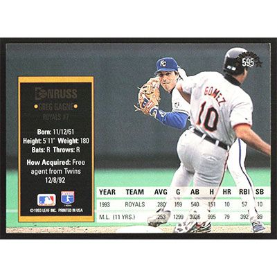 This is a 1994 Donruss Greg Gagne baseball card. The card is #595 and pictures show condition.