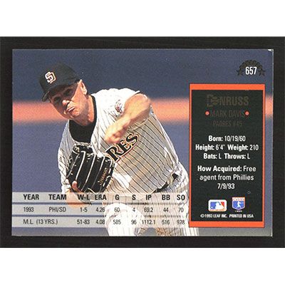 This is a 1994 Donruss Mark Davis baseball card. The card is #657 and pictures show condition.