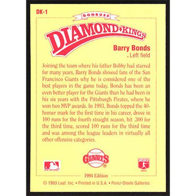 This is a 1994 Donruss Diamond Kings Barry Bonds baseball card. The card is #DK-1 and pictures show condition.