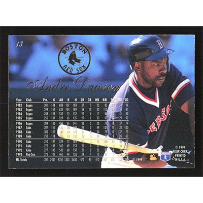 This is a 1994 Flair Andre Dawson baseball card. The card is #13 and pictures show condition.