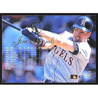 This is a 1994 Flair Jim Edmonds baseball card. The card is #21 and pictures show condition.