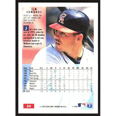 This is a 1994 Fleer Jim Edmonds baseball card. The card is #54 and pictures show condition.
