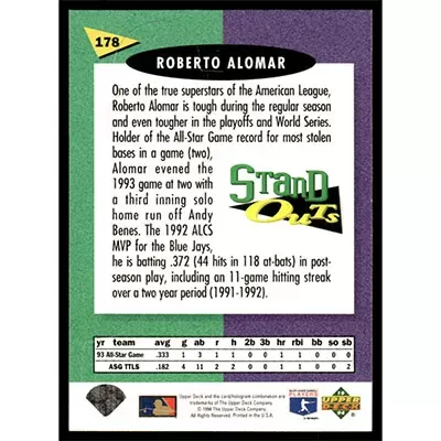 This is a 1994 Fun Pack Roberto Alomar Stand Outs baseball card. The card is #178 and pictures show condition.
