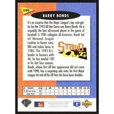 This is a 1994 Fun Pack Barry Bonds Stand Outs baseball card. The card is #190 and pictures show condition.