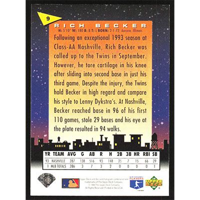 This is a 1994 Fun Pack Rich Becker Stars of Tomorrow baseball card. The card is #9 and pictures show condition.