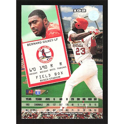This is a 1994 Leaf Bernard Gilkey baseball card. The card is #152 and pictures show condition.