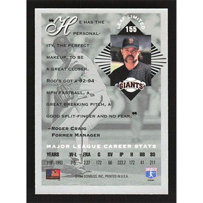 This is a 1994 Leaf Limited Rod Beck baseball card. The card is #155 and pictures show condition.