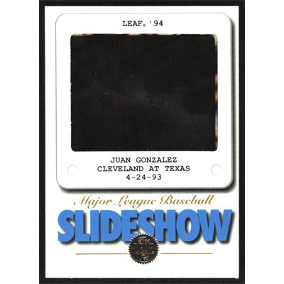 This is a 1994 Leaf Slideshow Juan Gonzalez baseball card. The card is #7 and pictures show condition.