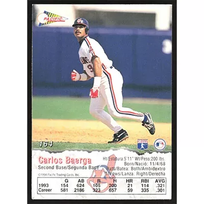 This is a 1994 Pacific Carlos Baerga Error baseball card. The card is #164, but is supposed to be #166. Pictures show condition. Team(s): Cleveland Indians