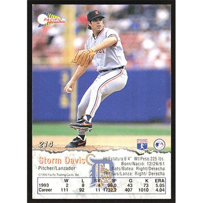 This is a 1994 Pacific Storm Davis baseball card. The card is #214 and pictures show condition.