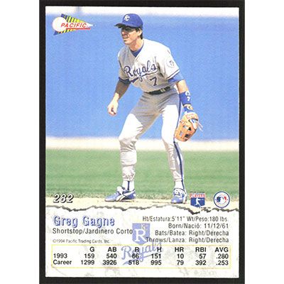 This is a 1994 Pacific Greg Gagne baseball card. The card is #282 and pictures show condition.
