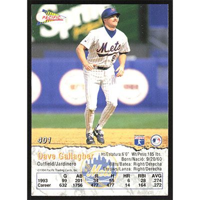 This is a 1994 Pacific Dave Gallagher baseball card. The card is #401 and pictures show condition.