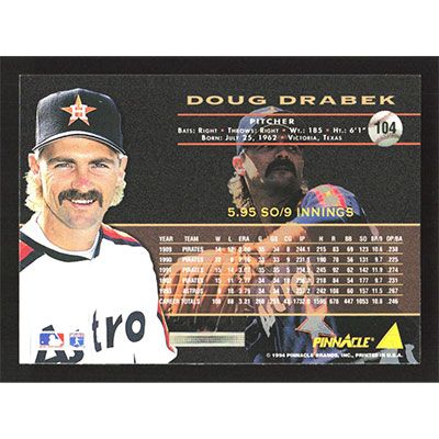 This is a 1994 Pinnacle Doug Drabek baseball card. The card is #104 and pictures show condition.