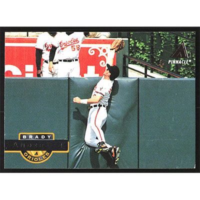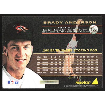 This is a 1994 Pinnacle Brady Anderson baseball card. The card is #165 and pictures show condition.