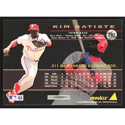 This is a 1994 Pinnacle Kim Batiste baseball card. The card is #207 and pictures show condition.