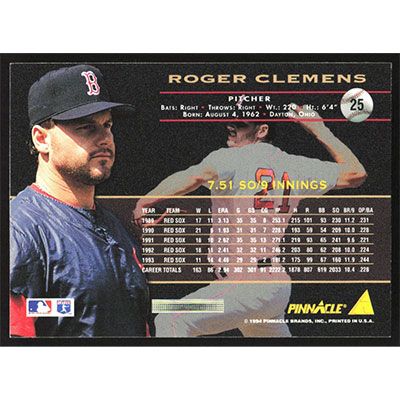 This is a 1994 Pinnacle Roger Clemens baseball card. The card is #25 and pictures show condition.