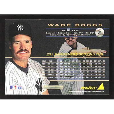 This is a 1994 Pinnacle Wade Boggs baseball card. The card is #31 and pictures show condition.