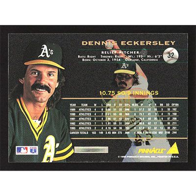 This is a 1994 Pinnacle Dennis Eckersley baseball card. The card is #32 and pictures show condition.