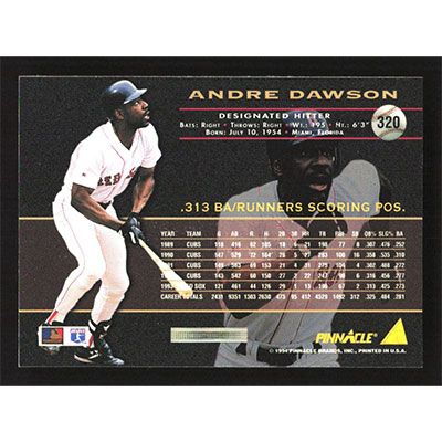 This is a 1994 Pinnacle Andre Dawson baseball card. The card is #320 and pictures show condition.