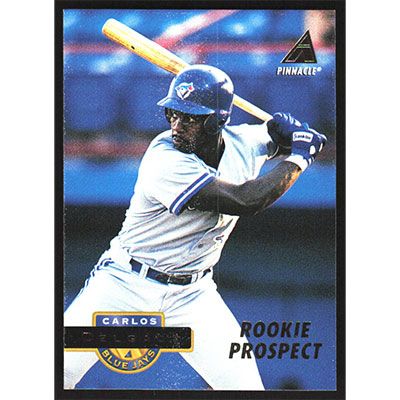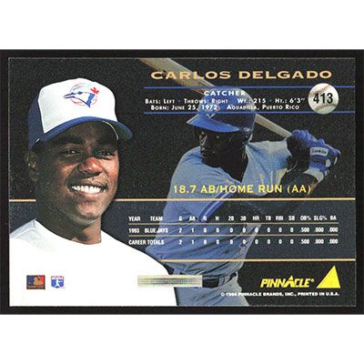 This is a 1994 Pinnacle Carlos Delgado baseball card. The card is #413 and pictures show condition.